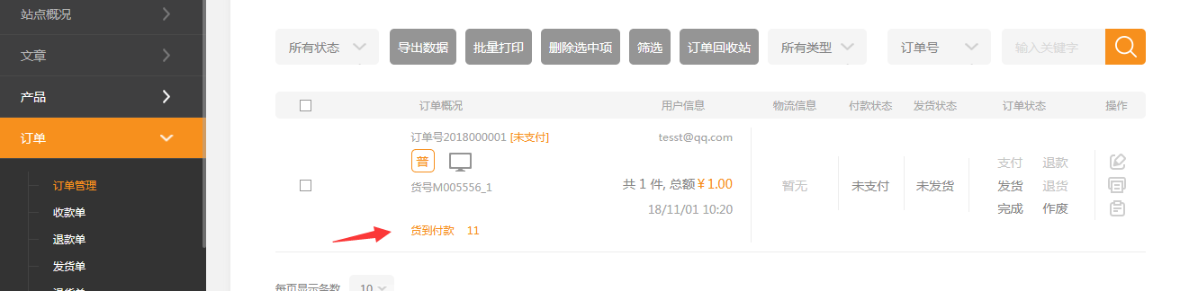 4.在后台订单管理中可以看到货到付款的订单,点击发货后 支付按纽可以点击。(由物流公司代收款后,再回到订单管理中点击支付即可)