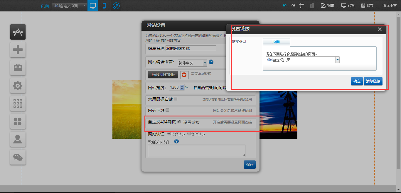 1.以PC版为例,在编辑器页面中制作一个“404”页面,制作完成后,点击“设置”-“网站设置”-“自定义404网页”勾选后选择“设置连接”即可,如图所示: